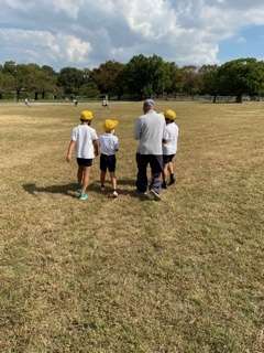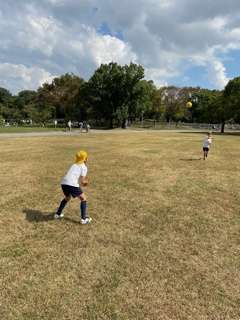 芝生でボール遊びをしたり、紙飛行機の飛ばし方を聞いたりしています。