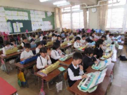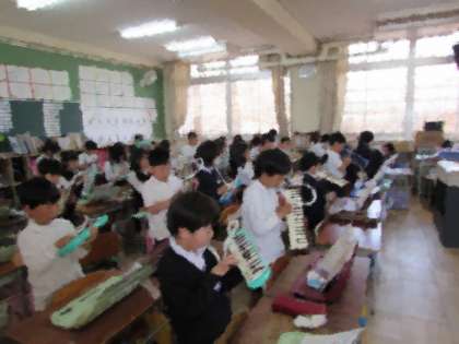 2年生の音楽の学習の様子です。鍵盤ハーモニカを使って、「かえるのがっしょう」を演奏しています。グループに分かれて、「おいかけっこ」を楽しんでいます。