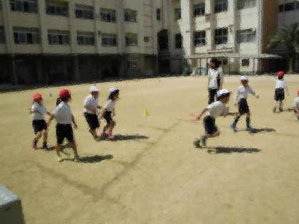 縄跳びの後、今日はリレーにチャレンジしました。バトンの渡し方、コーナートップなどを学習して、リレーを行いました。