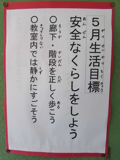 5月の生活のめあてです。5月のめあては、「安全なくらしをしよう」です。具体目標は、