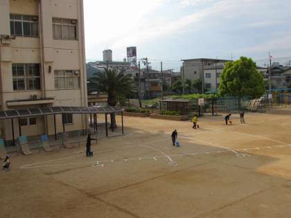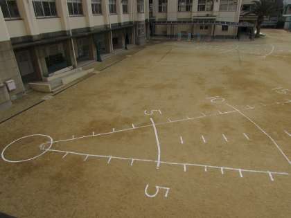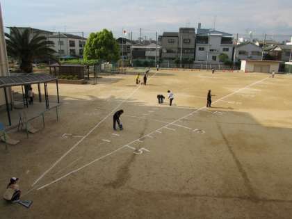 明日、3・4・5・6年生の体力テスト(ソフトボール投げ)を行います。そのラインを、今日の放課後、職員で引きました。