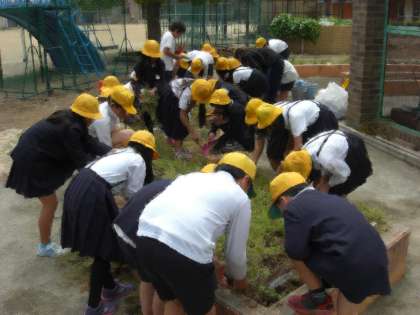 5年生は学習園で、なにわの伝統野菜の一つである「勝間南瓜(こつまなんきん)」を育てます。本日は5年生が、学習園の雑草抜きをしました。ずいぶんと雑草が繁茂していましたが、子どもたちは手際よく、協力して、学習園をきれいにすることができました。さすが5年生です。