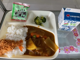 本日の献立は、海老フライカレーライス、ブロッコリーのサラダ、ソフト黒豆です。