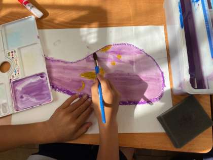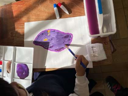 絵の具で色を混ぜて、紫をつくって、いもの色を表現しました。