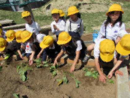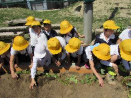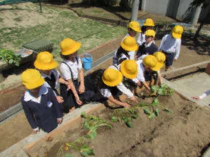 2年生の生活科の学習の様子をご紹介します。今日は、学習園に、サツマイモの苗を植えました。秋には収穫をして、皆でおいもパーティーをする予定です。