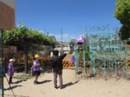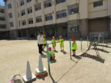 わかば学級の活動の様子です。毎週月曜日の2時間目には「わかばタイム」として、わかば学級に集う子どもたち全員で、活動をしています。今日は運動場で、遊具や道具を使って、活動をしていました。