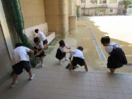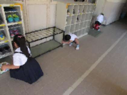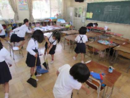 1年生のそうじの様子をご紹介します。1年生も分担を決め、自分たちでそうじをしています。6年生や2年生からもお手伝いが来て、1年生にそうじの仕方を教えています。