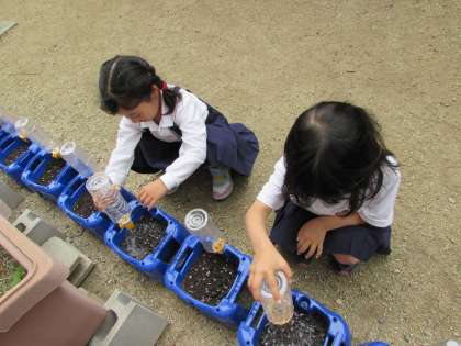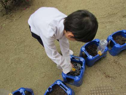 昨日、1年生は生活科の学習で、アサガオの種まきをしました。ひとり1鉢ずつ、アサガオを育てます。登校してきて、朝の準備ができた子から、アサガオの水やりをします。
