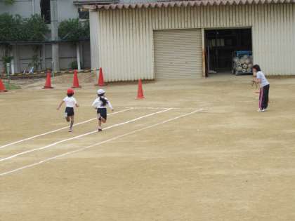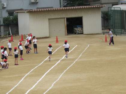 3年生の体力テストの様子です。3年生が、50メートル走のタイムを計測しています。昨年と比べて、どれだけタイムを縮められたかな。