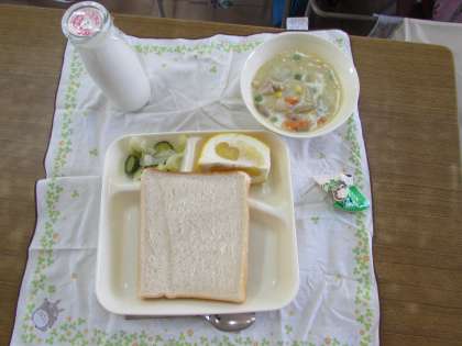 本日の給食の献立をご紹介します。本日の献立は、食パン、マーガリン、コーンクリームシチュー、グリーンサラダ、河内ばんかん、牛乳でした。
