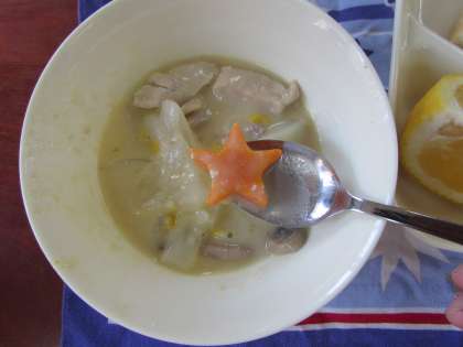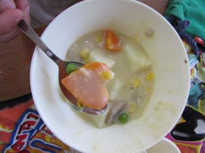 今日のクリームシチューにも、ハートや星の形をした「ラッキーにんじん」が見つかるものがありました。