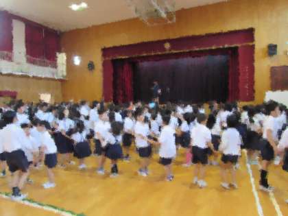 集会の後半には、ペアで一緒に手をつないで活動をするゲームをして楽しみました。来週からは毎木曜日の朝、児童集会を行います。8時25分の集合に遅れないように登校しましょう。