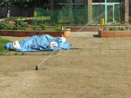 校庭の芝の張り替えが終わり、芝の定着を待っている状態です。今年度、芝のところにスプリンクラーを設置しました。散水時に、地面の下から出てきて、水を撒きます。昨年まで、夏の暑い時期にもPTAや地域の皆様にも水撒きをお願いしていましたが、今年はスプリンクラーが活躍してくれそうです。