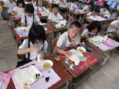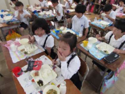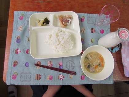 本日の給食の献立をご紹介します。本日の献立は、ご飯、アカウオのしょうゆだれがけ、みそ汁、わかたけ煮、牛乳です。
