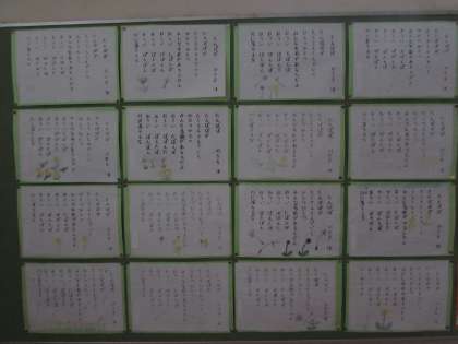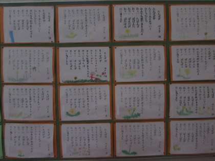踊り場の掲示板の作品をご紹介します。3年生は硬筆書写「たんぽぽ」です。「たんぽぽ」の、いろいろな名前が面白い詩です。