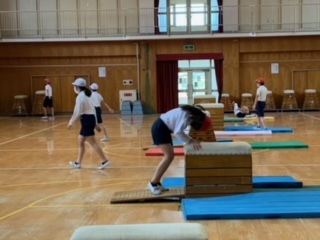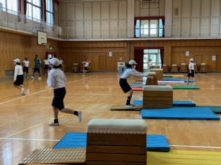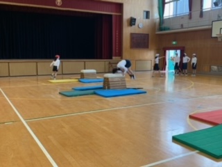 開脚跳び、台上前転、かかえこみ跳びをしました。