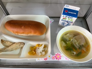 本日の献立は、わかさぎフライ、スープ、カリフラワーとコーンのサラダです。