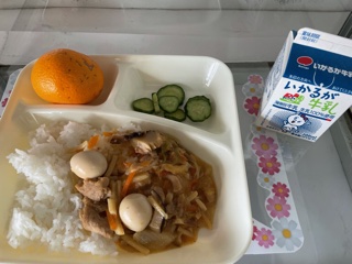 本日の献立は、中華どんぶり、きゅうりの中華和え、みかんです。 みかんがおいしい季節になりましたね。