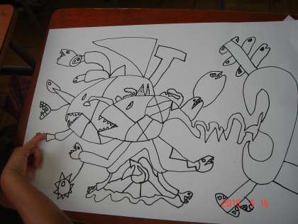4年生の学習です。1組は図工で、「不思議な魚」に取り組みました。