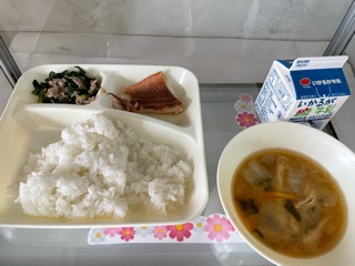 11月25日(木)の献立は、赤魚のしょうゆだれかけ、味噌汁、小松菜の炒めものです。