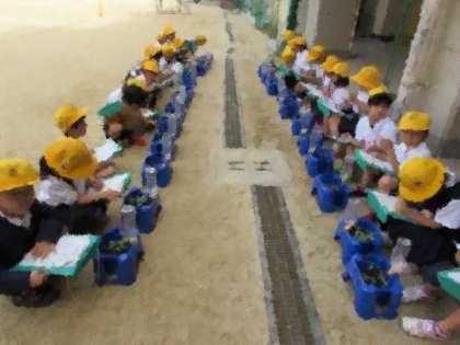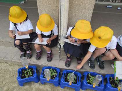 2時間目、1年生も生活科の学習で、アサガオの観察をしました。どの子のアサガオも、立派な双葉が出ていました。子どもたちは、葉っぱの形や色をしっかりと見て、記録をしていくことができました。