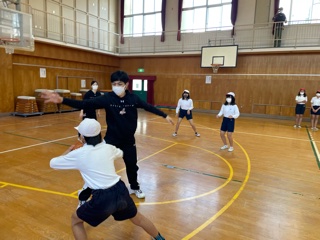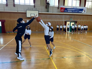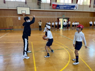 本日は大阪エヴェッサの方々を招いて、バスケットボールの学習に取り組みました。