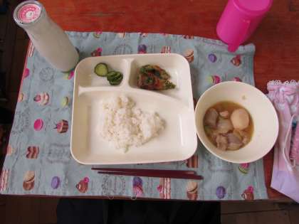 本日の給食の献立をご紹介します。本日の献立は、ご飯、ちくわの磯部揚げ、鶏肉とさといもの煮物、あっさりきゅうり、牛乳でした。