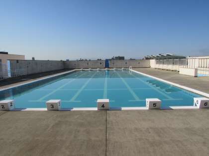 千本小学校の屋上プールです。今年は再塗装を終え、プール底がきれいになりました。朝の日の光を浴びて、水面がきらきらと輝いています。