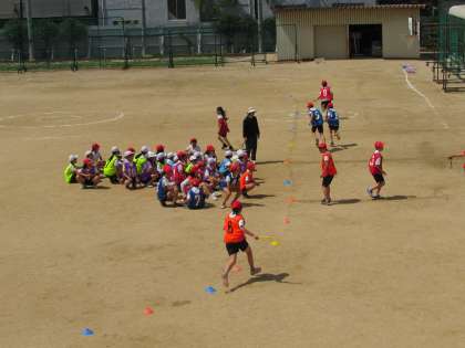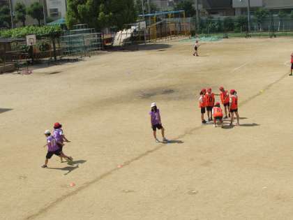 6年生の体育です。初めにリレーを行い(画像上)、そこから更にチームとして作戦を考え、練習に取り組みました(画像中・下)。