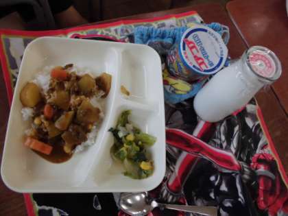 本日の給食の献立をご紹介します。本日の献立は、牛肉と大豆のカレーライス、レタスのサラダ、ヨーグルト、牛乳でした。