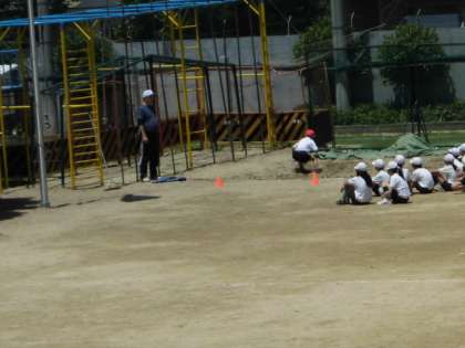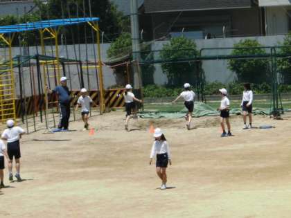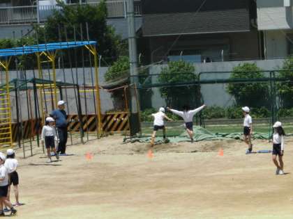 5年生の体育の学習の様子です。5年生が砂場で、走り幅跳びの練習をしています。今日は、両足でしっかりと着地をすることを目指して、取り組みました。