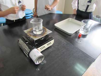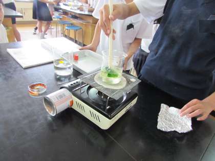 6年1組の理科の学習の様子です。今日は、日光の当たった葉と、日光の当たらなかった葉とで、でんぷんのでき方の違いを調べました。葉を茹でて、やわらかくし、ヨウ素溶液で反応を調べました。