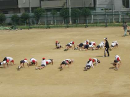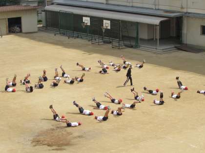 6年2組が、体育の学習を行っています。6年生は、5年生の時から、体育の中で組み立て体操の基本技に取り組んできました。一人技は、ずいぶんとできているようです。