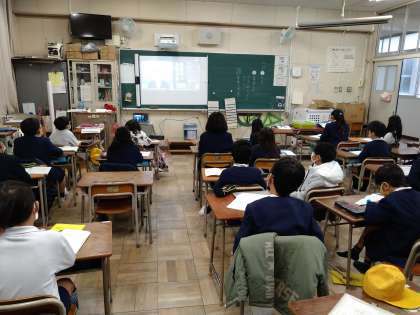 校長先生、生活指導の先生の話を聞いた後、元気いっぱい校歌を歌いました。