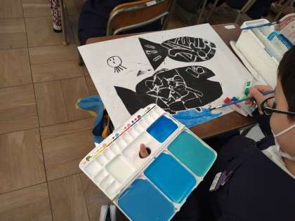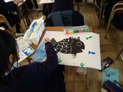 製版し、クレパスで海の中の友だちを描き、絵の具で着色しました。