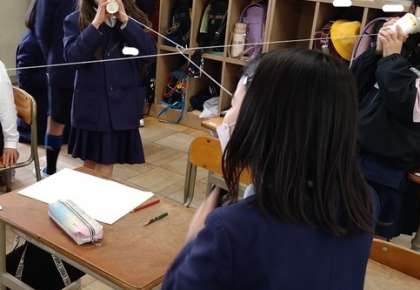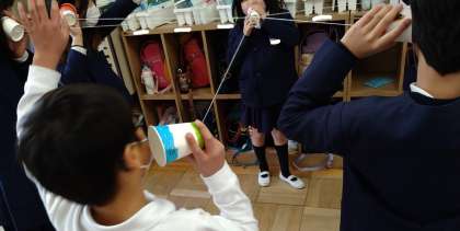 糸電話を使い学習しました。音がつたわるときは、糸がふるえていることに気づくことができました。