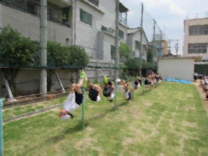 校庭の芝生の張り替えをして2週間あまり。芝の養生も、進んでいます。昨日から、運動場の北側、鉄棒の周囲が開放となりました。体育で取り組む学年があり(画像上)、また、休み時間には多くの子どもたちが「待ってました!」とばかりに、鉄棒で遊んでいます(画像下)。