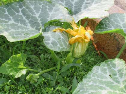 学習園に行ってみますと、5年生の学習園で育てている勝間南瓜(こつまなんきん)に、一つ、黄色の花が咲いていました。花の付け根を見てみると、丸く膨らんでいます。雌花です。