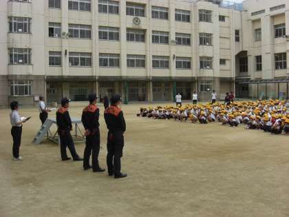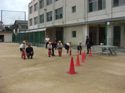 運動場に集合した後、西成消防署の方に、消火訓練を体験させていただきました。6年生の代表児童と、6年生の担任の先生とで、水消火器を使い、炎に見立てたコーンに向けて水をかけました。