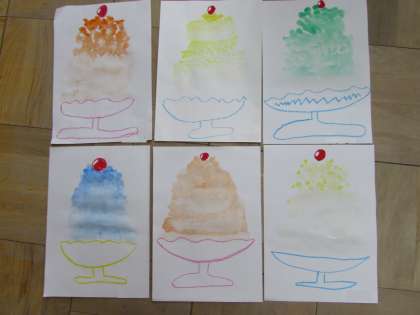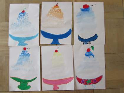 今日は、好きな色を1色選び、水を含ませていくと色が薄くなることを利用して、かき氷を描きました。次回は、色作り(混色)の学習をします。