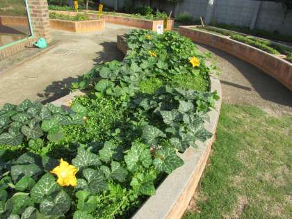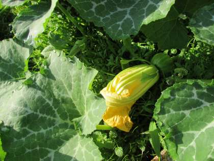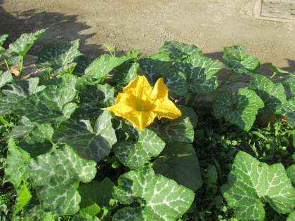 5年生が育てている勝間南瓜(こつまなんきん)は、毎日のように花を咲かせています。花の根元が膨らんでいる雌花も、けっこう咲いています(画像下)。