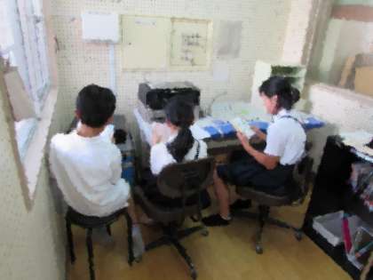 読書タイムに、音楽を流している図書委員会の子どもたちも、放送室で本を読んでいます(画像下)。