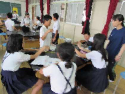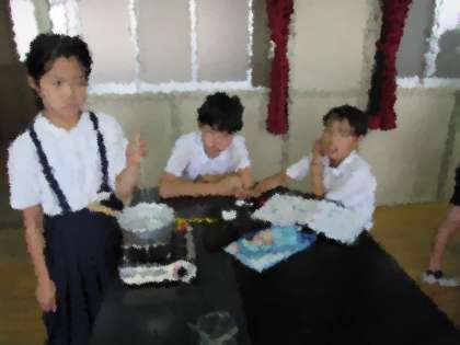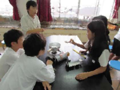 6年生の学習の様子です。6年2組が、理科室で学習をしています。唾液による食べ物の変化を調べるための実験を行っています。