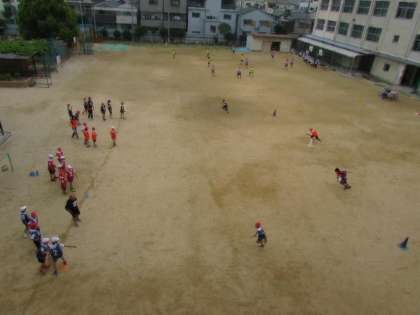 屋外スポーツクラブは、チームに分かれて、リレーを行いました(画像下)。