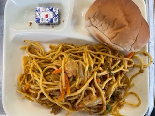 本日の献立は、カレースパゲッティ、レタスとコーンのサラダ、固形チーズです。