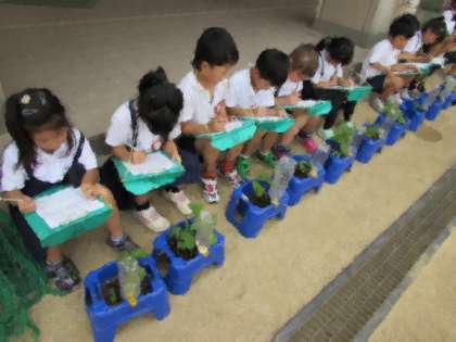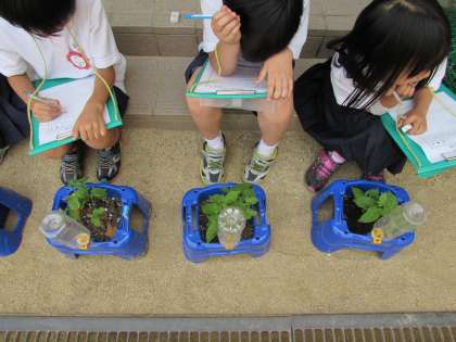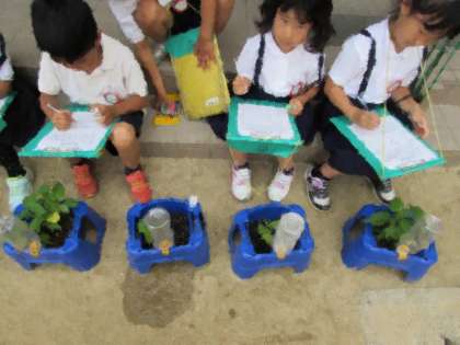アサガオの観察です。アサガオは、つるを伸ばし始めました。そろそろ支柱を立てようか、と考えています。