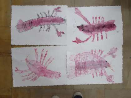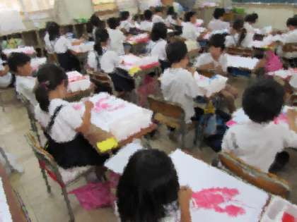 2年生の図画工作の学習の様子をご紹介します。2年生は、生活科の学習でザリガニの飼育・観察をしています。そのザリガニをパスで描き、今日、絵の具で彩色をしました。先に学習した色づくりの技法を使って、ザリガニらしい色を工夫しました。