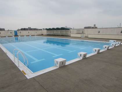 千本小学校の屋上プールです。清掃を終え、水面がきらきらと輝いています。