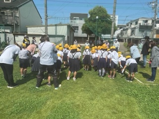 地域の方々や保護者のみなさんに来ていただいて、芝生管理をしました。