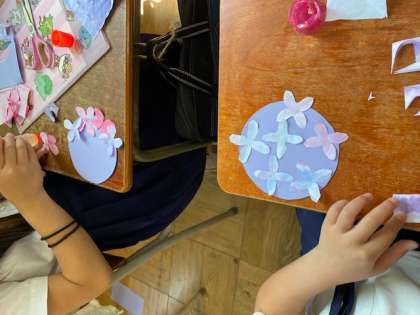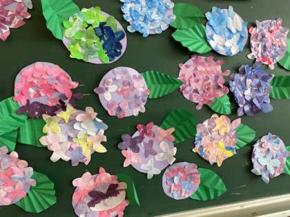 半紙に絵の具をぬって、あじさいの花びらを作りました。